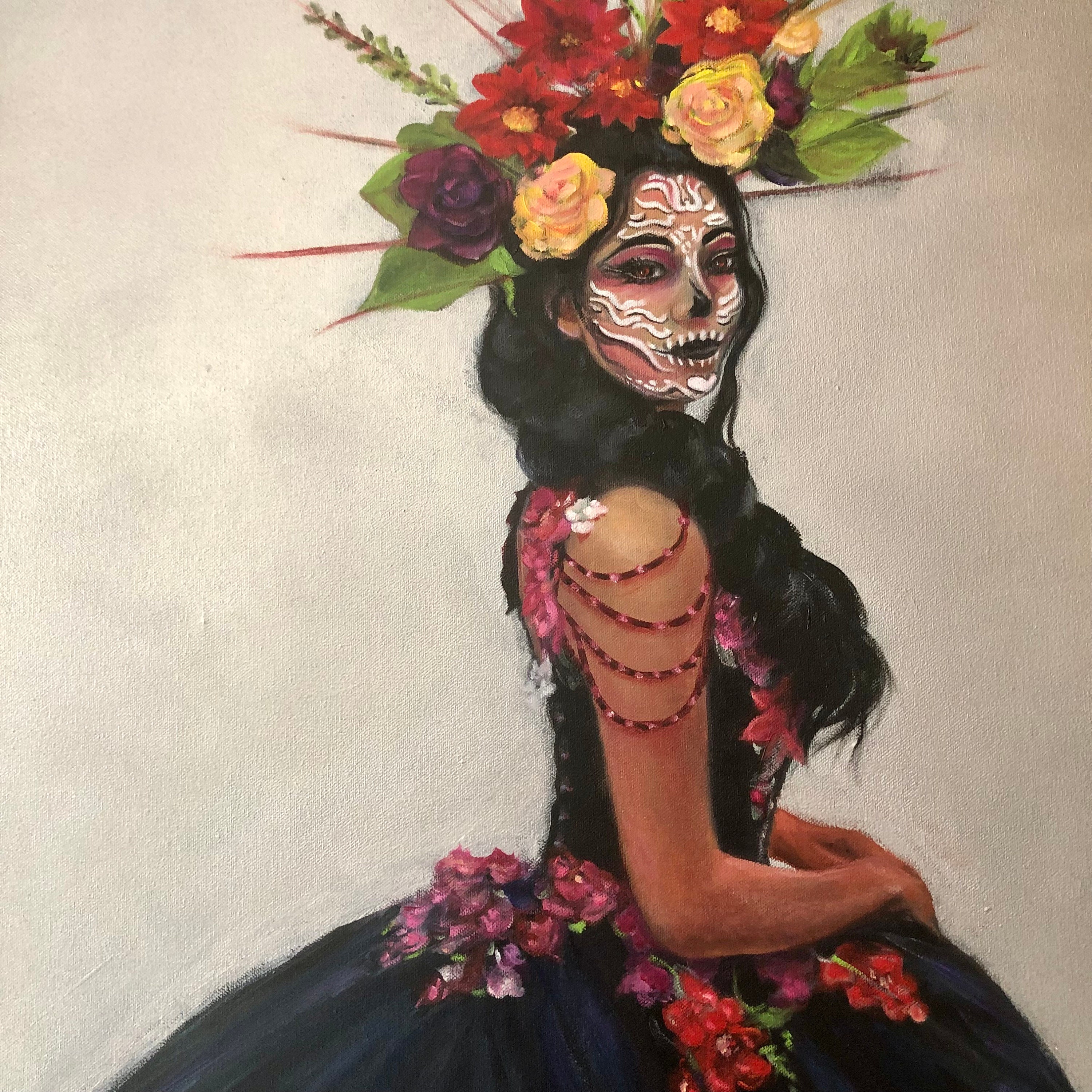 This captivating oil painting captures the essence of Dia de los Muertos, the vibrant Day of the Dead tradition. A young woman adorned with intricate sugar skull makeup gazes forward, embodying the spirit of the holiday.